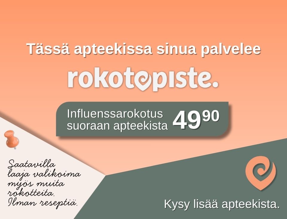 Rokotepisteellä voit ottaa tarvitsemasi rokotukset apteekkikäyntisi yhteydessä. Ajan rokotukseen voit varata apteekissa tai netissä. Mikäli meillä on vapaa rokotusaika, pääset halutessasi heti rokotettavaksi. Koulutettu henkilökuntamme huolehtii, että saat tarvittavat rokotteet sujuvasti. Apteekin farmaseuttinen henkilöstö voi rokottaa 18 vuotta täyttäneitä.